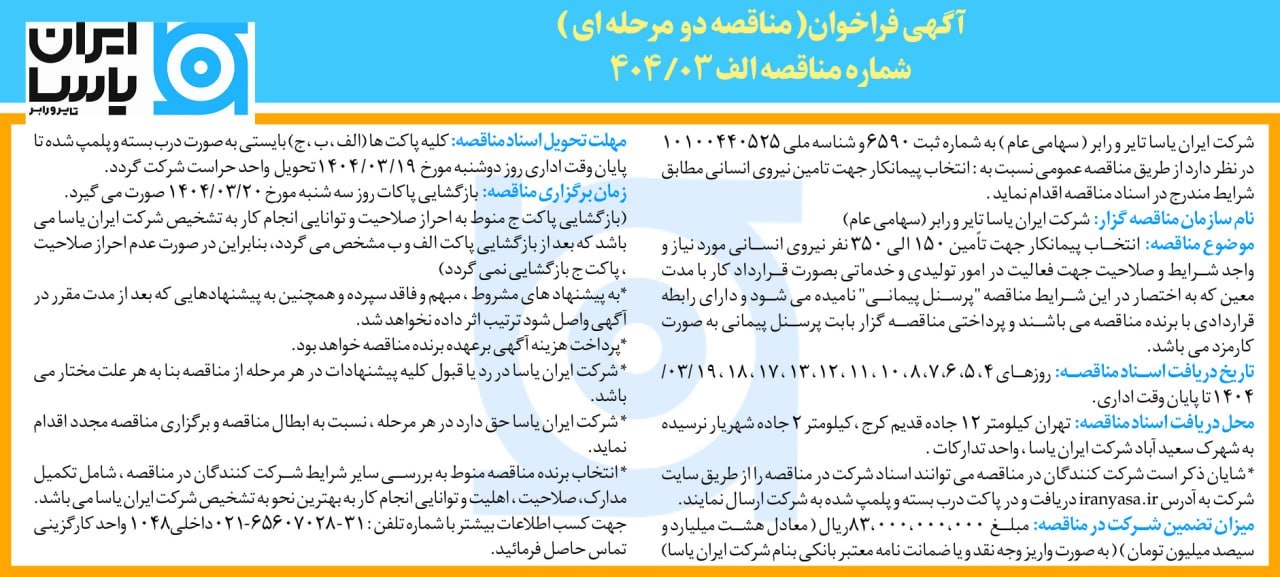 شرکت ایران یاسا تایر و رابر ( سهامی عام ) به شماره ثبت 6590 و شناسه ملی 10100440525 در نظر دارد از طريق مناقصه عمومي نسبت به انتخاب پیمانکار برای تامین نیروی انسانی مطابق شرایط مندرج در اسناد مناقصه اقدام کند.