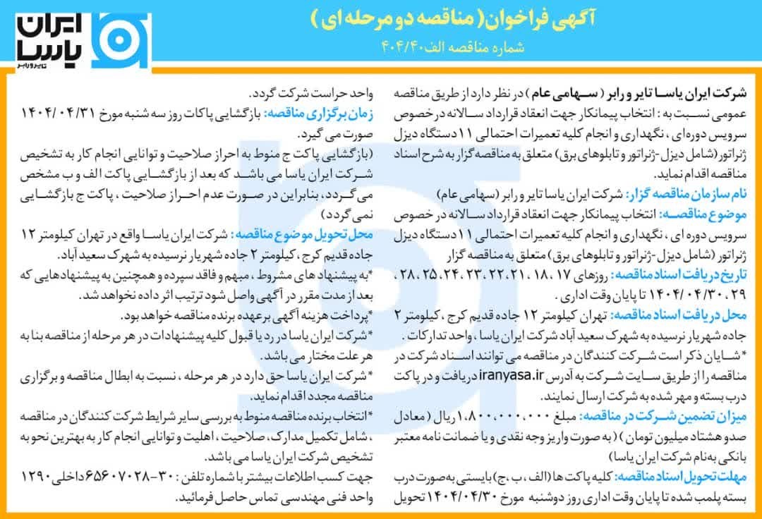 شرکت ایران یاسا تایر و رابر ( سهامی عام) در نظر دارد از طريق مناقصه عمومي نسبت به انتخاب پیمانکار به منظور انعقاد قرارداد سالانه در خصوص سرویس دوره ای، نگهداری و انجام تمامی تعمیرات احتمالی 11 دستگاه دیزل ژنراتور شامل دیزل -ژنراتور و تابلوهای برق متعلق به مناقصه گزار به شرح اسناد مناقصه اقدام کند.