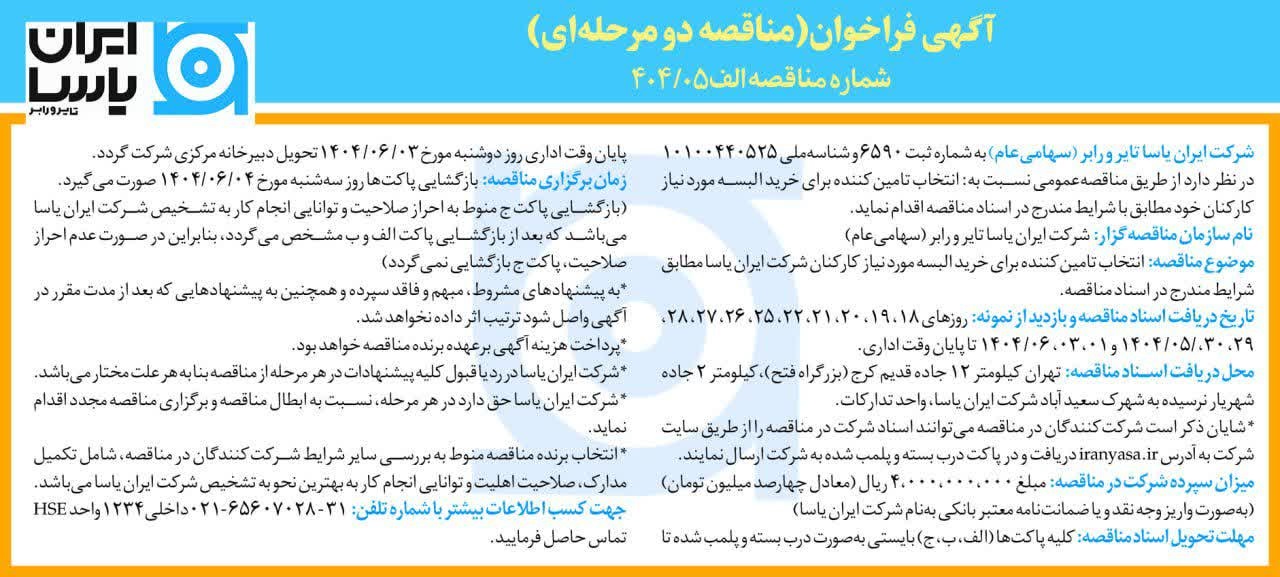 شرکت ایران یاسا تایر و رابر (سهامی عام) به شماره ثبت 6590 و شناسه ملی 10100440525 در نظر دارد از طريق مناقصه عمومي نسبت به انتخاب تامین کننده برای خرید البسه مورد نیاز کارکنان خود مطابق با شرایط مندرج در اسناد مناقصه اقدام کند.