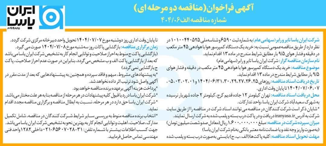 شرکت ایران یاسا تایر و رابر (سهامی عام) به شماره ثبت 6590 و شناسه ملی 10100440525 در نظر دارد از طريق مناقصه عمومي نسبت به خرید یک دستگاه کمپرسور هوا با هوادهی 45 متر مکعب در دقیقه و فشار هوای 5/9 بار مطابق شرایط مندرج در ماده 13 اقدام کند.