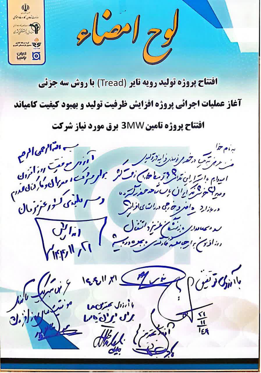 لوح یابود بهره برداری و کلنگ زنی سه پروژه راهبردی شرکت ایران یاسا تایر و رابر روز سه شنبه بیست و یکم بهمن ماه 1404 از سوی مقامات کشوری و استانی امضاء شد.
