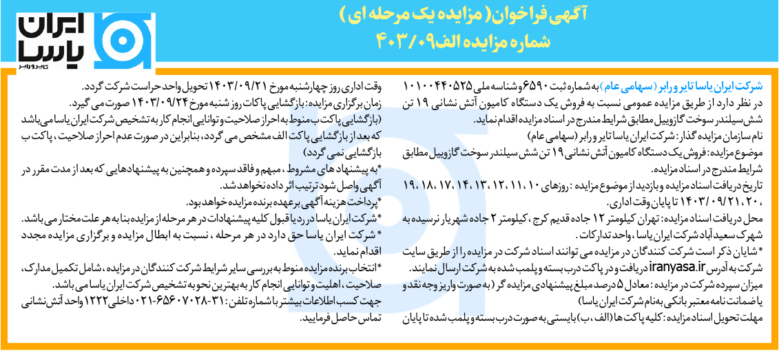 شرکت ایران یاسا تایر و رابر ( سهامی عام ) به شماره ثبت  6590 و شناسه ملی 10100440525در نظر دارد از طريق مزایده عمومی نسبت به فروش یک دستگاه کامیون آتش نشانی 19 تن شش سیلندر سوخت گازوئیل مطابق شرایط مندرج در اسناد مزایده اقدام نماید.