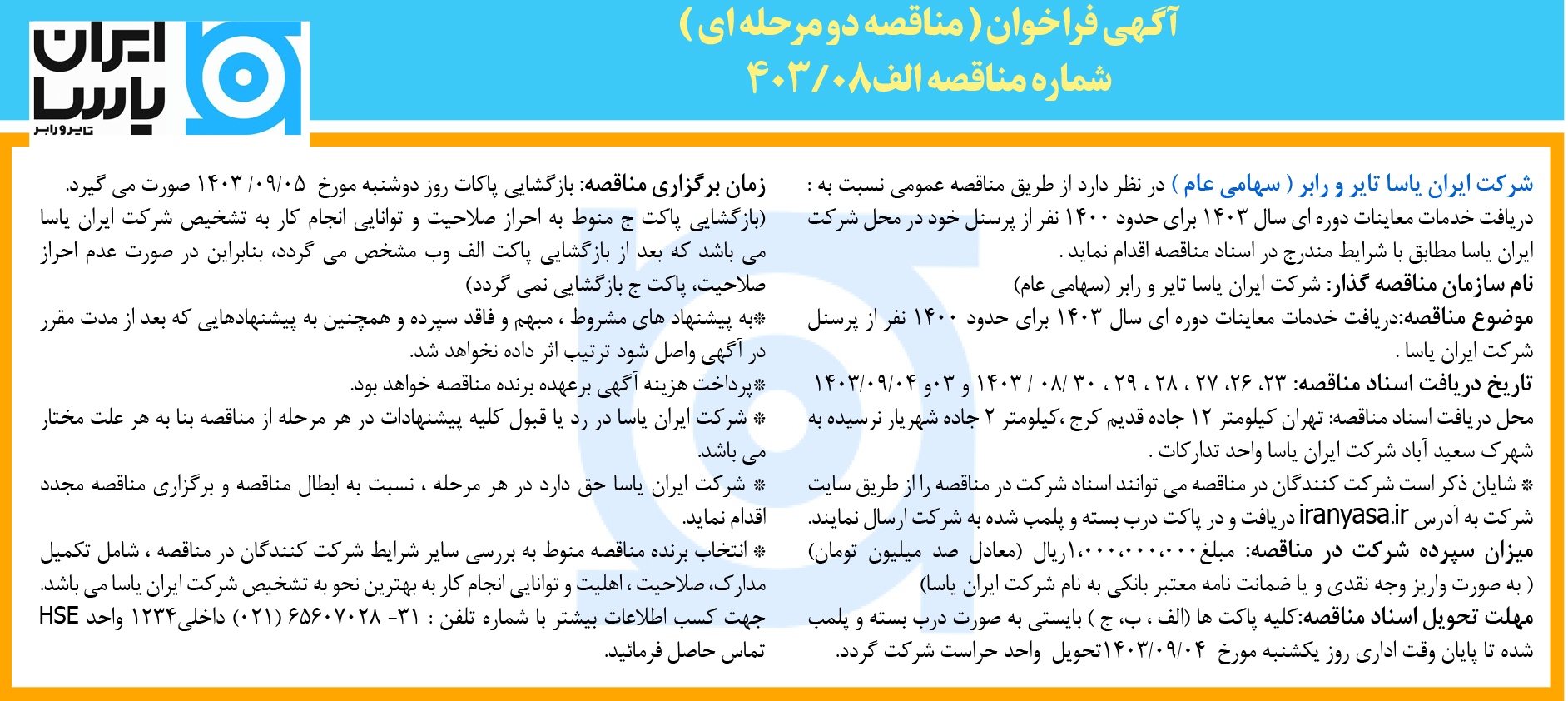 شرکت ایران یاسا تایر و رابر ( سهامی عام ) در نظر دارد از طريق مناقصه عمومي نسبت به: دریافت خدمات معاینات دورهای سال 1403 برای حدود 1400 نفر از پرسنل خود با شرایط ذیل در محل شرکت ایران یاسا مطابق با شرایط مندرج در اسناد مناقصه اقدام نماید.
