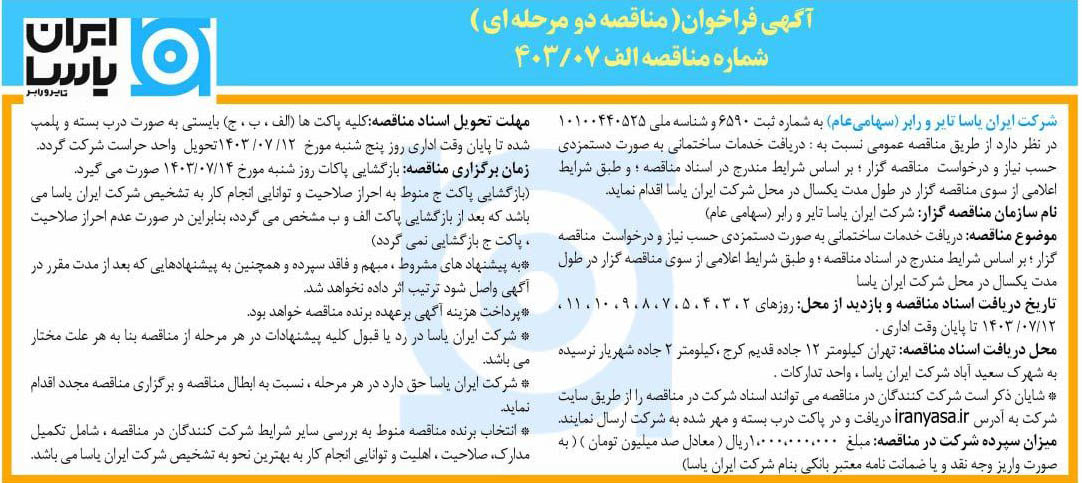 شرکت ایران یاسا تایر و رابر ( سهامی عام ) به شماره ثبت  6590 و شناسه ملی 10100440525در نظر دارد از طريق مناقصه عمومي نسبت به : دریافت خدمات ساختمانی به صورت دستمزدی حسب نیاز و درخواست مناقصه گزار؛ براساس جدول پیوست شماره 1؛ و طبق شرایط اعلامی از سوی مناقصه‌گذار در طول مدت یکسال اقدام نماید.