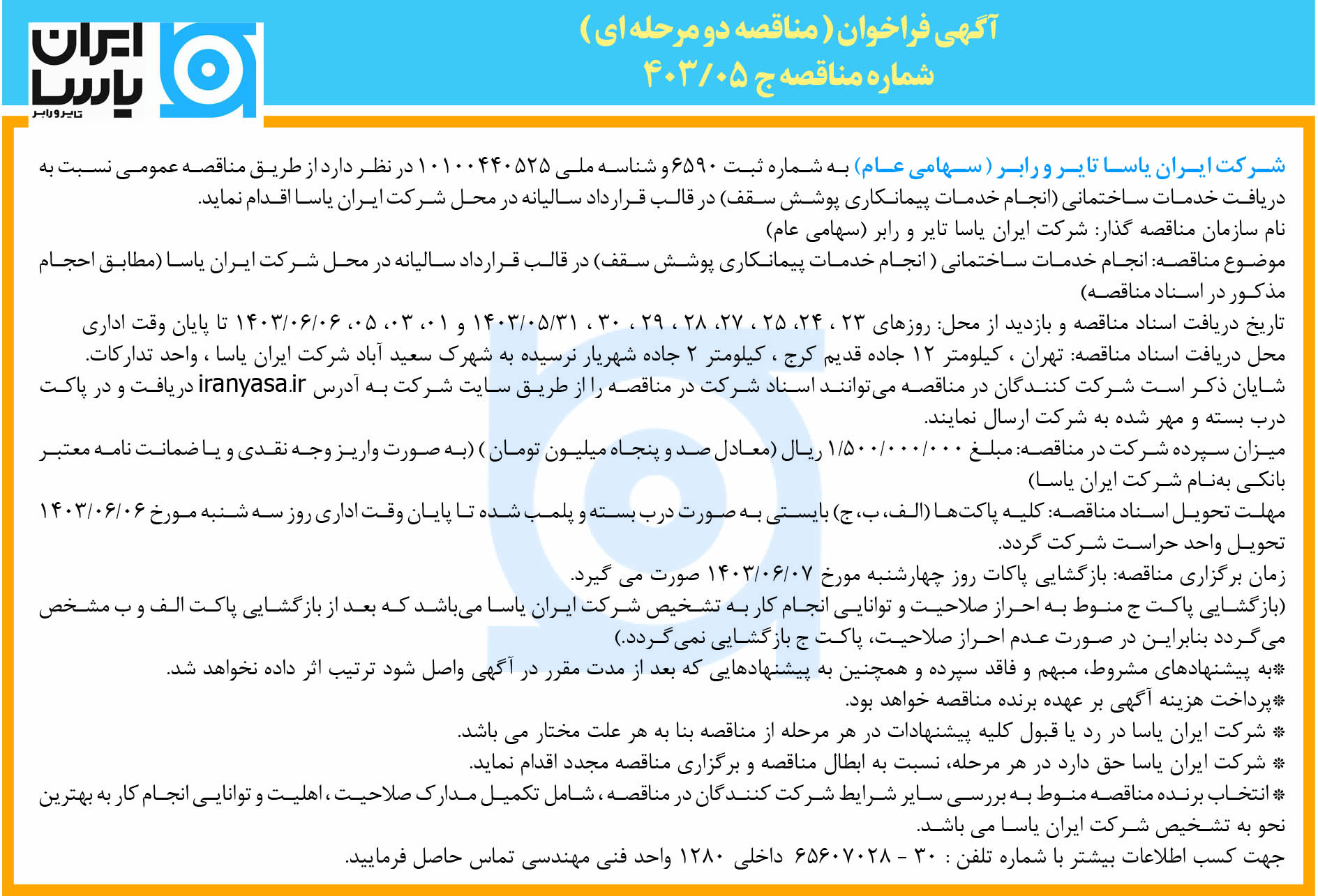 شرکت ایران یاسا تایر و رابر ( سهامی عام ) به شماره ثبت 6590 و شناسه ملی 10100440525در نظر دارد از طريق مناقصه عمومي نسبت به : دریافت خدمات ساختمانی( انجام خدمات پیمانکاری پوشش سقف) در محل شرکت ایران یاسا و در قالب قرارداد سالیانه اقدام نماید.