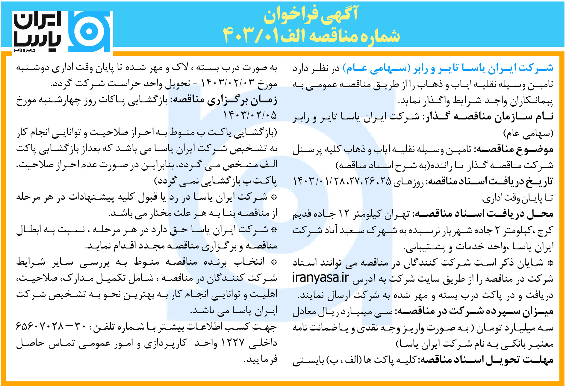 ﺷـﺮﮐﺖ اﯾـﺮان ﯾﺎﺳـﺎ ﺗﺎﯾـﺮ و راﺑﺮ (ﺳـﻬﺎﻣﻰ ﻋـﺎم) در نظر دارد تامیـﻦ وسیله نقلیه ایـاب و ذﻫـاب را از ﻃریـﻖ مناقصه عمومـی بـه پیمانکاران واﺟـد شرایط واگـﺬار نماید