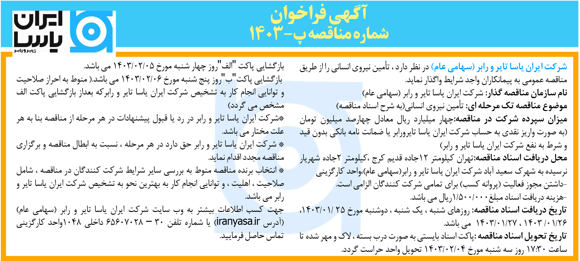 ﺷﺮﮐﺖ اﯾﺮان ﯾﺎﺳﺎ ﺗﺎﯾﺮ و راﺑﺮ (ﺳﻬﺎﻣﻰ ﻋﺎم) در نظر دارد ، تامین نیروی انسانی را از طریق مناقصه عمومی به پیمانکاران واﺟد شرایط واگذار نماید.